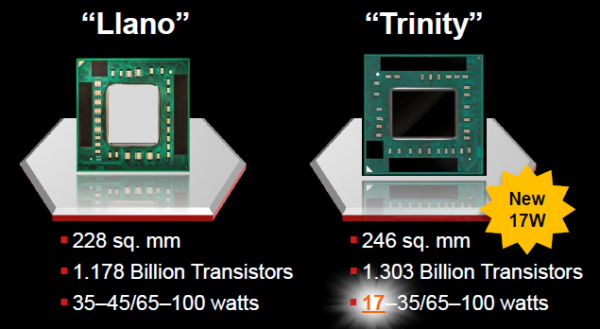 In onze review van de AMD A10 'Trinity' APU schreven we al dat de LIano-chip met een oppervlak van 228 mm2 1,18 miljard transistors bevat en de Trinity met een oppervlak van 246 mm2 ongeveer 1,3 miljard transistors heeft. Deze berekening van het aantal transistors verliep niet zonder problemen, want eerder gaf AMD nog een hoger aantal door.