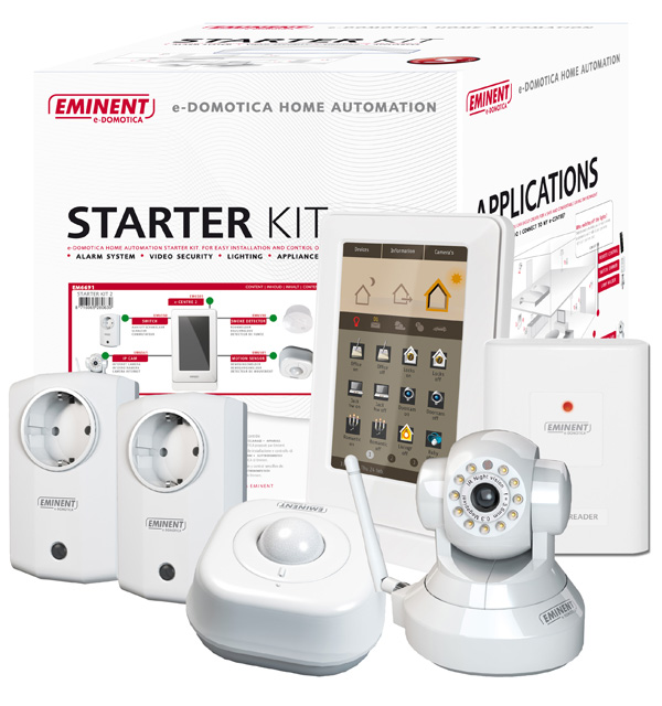 Onder het e-Domotica label heeft Eminent een pakket uitgebracht waarmee de beginnende gebruiker een complete basis kan aanschaffen. De fabrikant geeft aan dat de e-Domotica Starterskit gebruiksklaar en eenvoudig te installeren is, tevens biedt het de mogelijkheid om het geheel te bedienen via een computer, tablet of een smartphone met internetverbinding.