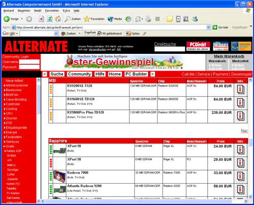 De kogel is door de kerk, eindelijk zijn de eerste grafische kaarten van MSI op de open markt gesignaleerd. Al langer werden grote OEM-klanten (zoals Medion) voorzien van ATI producten van de grote componentenfabrikant uit Taiwan. Maar inmiddels zijn de kaarten dan ook écht voor de normale klant leverbaar geworden. Op de Duitse website van Alternate www.alternate.de zijn drie ATI producten van MSI te vinden: