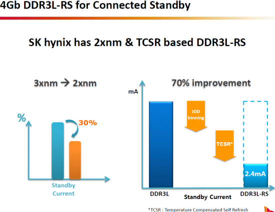 SK Hynix heeft DDR3L-RS DRAM modules geïntroduceerd die een lager energieverbruik moeten hebben in standby. De Reduced Standby (RS) modules maken gebruik van een 20 nm productieproces en krijgen een klokfrequentie van 1600 MHz. Uiteindelijk zou het stroomverbruik in standby met 70% worden verlaagd ten opzichte van de huidige zuinige DDR3L standaard. Ten opzichte van het energiezuinige LPDDR3 geheugen dat ook tijdens gebruik een flink lager energieverbruik heeft zijn de DDR3L-RS modules iets goedkoper en zou het verbruik niet heel veel schelen. De modules komen beschikbaar met capaciteiten van 2 Gbit, 4 Gbit en 8 Gbit in zowel een DDR3L-RS DRAM uitvoering als SO-DIMM uitvoering.