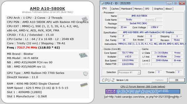 Het is GASBK_TW gelukt om middels een Biostar Hi-Fi A85X moederbord, 4 GB DDR3-geheugen afkomstig van G.Skill en wat vloeibare stikstof een frequentie van 7317,74 MHz te halen. Hierbij is de Turbo modus en zijn twee rekenkernen uitgeschakeld, het voltage is verhoogd naar 1,956 V.