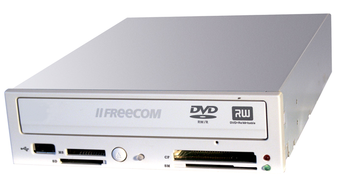 De FC-10 8x DVD+/-RW-drive met geïntegreerde 7-in-1-cardreader is het nieuwe vlaggenschip van de Internal-productlijn van Freecom. De drive combineert een DVD+/-RW-brander, CD-RW-brander DVD/CD-ROM-drive en een cardreader in één apparaat. De Freecom FC-10 is beschikbaar als interne versie voor de PC en wordt verbonden via de IDE- en USB-poorten. De hi-speed DVD-brander schrijft DVD's met een snelheid van 8x voor DVD+R- en DVD-R-schijven, en CD's met een snelheid van 40x. De FC-10 biedt niet alleen een DVD- en CD-brander, maar ook een geïntegreerde 7-in-1-cardreader. Deze cardreader ondersteunt CompactFlash, MicroDrive, Smart Media, Memory Stick, Memory Stick Pro, Secure Digital en MultiMediaCard.