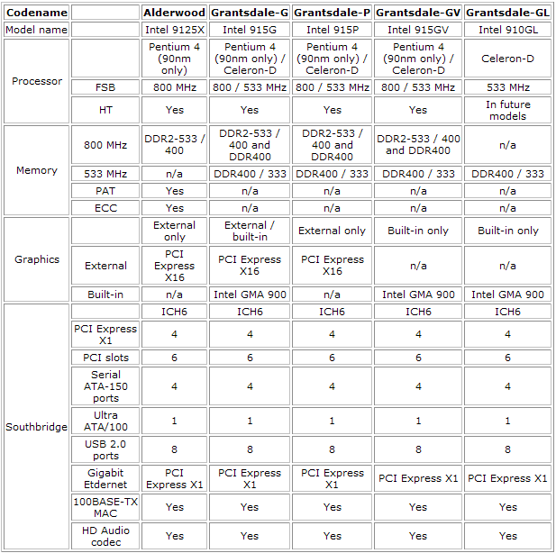De processoren die in juni op de markt komen worden vergezeld door de introductie van de 925x chipset Alderwood en de Grantsdale klasse 915P en 915G. Alle drie ondersteunen alleen 90nm P4’s en in het geval van de Grantsdale de 90nm Celerons. De Grantsdale chipset ondersteunt ook de langzamere 533MHz PSP, Alderwood daarentegen alleen 800MHz en dan nog alleen de 533MHz of 400MHz DDR2. De 915 series daarentegen ondersteunen ook 400MHz DDR.