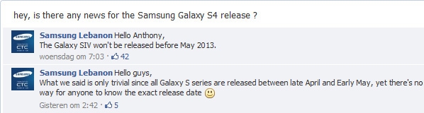 Volgens de exclusieve distributeur in Libanon komt de Galaxy S IV niet voor mei op de markt, men brengt dit naar buiten naar aanleiding van een vraag van een gebruiker. Men stelt dit op de Facebook-pagina van de distributeur aangezien alle smartphones uit de Galaxy S-reeks in mei zijn gelanceerd. De tijd zal ons leren wat van de geruchten bewaarheid zal worden.