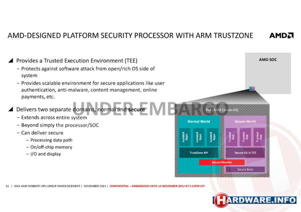 Bijzonder is dat zowel Mullins als Beema een ingebakken Security Processor bevat, gebaseerd op een ARM Cortex-A5 kern met ARM TrustZone-technologie. TrustZone is een in de ARM-wereld gestandaardiseerde technologie om een stuk programmacode volledig afgeschermd te laten draaien en wordt onder meer door Android en verschillende Android apps gebruikt voor de beveiliging van bijvoorbeeld online betalingen en dergelijke. Door het ondersteunen van TrustZone wil AMD haar chips ook juist meer geschikt maken voor Android-devices, denkelijk ook om zo mee te kunnen liften op het werk dat Intel doet om Android volledig geschikt te maken voor x86-processors.