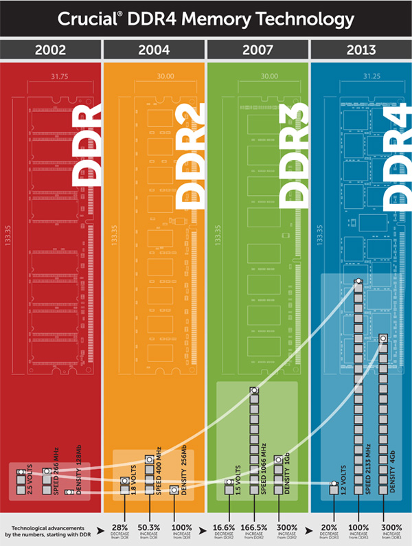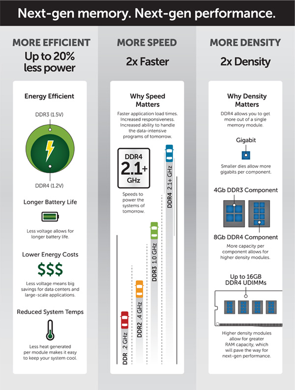 Naast een lager voltage zouden de klokfrequenties gaan toenemen en kunnen we een capaciteit van 16 GB per module verwachten. Dat DDR4 zuiniger werkt zal niet direct merkbaar zijn in een desktop, voor tablets, laptops, servers en data centers kan het echter een mooi voordeel bieden. Als we Crucial mogen geloven zou DDR4-geheugen moeten zorgen dat data tweemaal zo snel verwerkt kan worden, programma’s sneller starten en van het multitasken een prettigere ervaring maken.