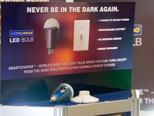 Op de CES kom je best bijzondere producten tegen. Een goed voorbeeld is de nieuwe SmartCharge: een LED-lamp met ingebouwde accu met voldoende capaciteit om de lamp te kunnen blijven gebruiken als de stroom uitvalt. De lamp merkt op dat de stroom uitvalt en herkent ook de stand van de aan/uitschakelaar en dus kun je de lamp in- en uitschakelen onafhankelijk of er wel of geen werkende stroomvoorziening is. Volgens de fabrikant is de accu voldoende om de lamp vier uur te gebruiken, de techniek vereist ook geen extra kabels of andere voorzieningen. Je kunt de lamp gewoonin de fitting draaien en het systeem werk direct.