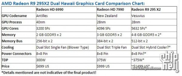 Dat betekent dat er 5632 shader units beschikbaar zijn, naast 352 TMU's en 128 ROP's. Verder heeft AMD gekozen voor in totaal 8 GB GDDR5, dat via de twee 512-bit geheugencontrollers aangesproken kan worden. De twee GPU's zijn overigens met elkaar verbonden via een PLX PEX8747 PCI-Express brug. Om het geheel koel te kunnen houden, maakt AMD mogelijk gebruik van een dual-slot hybride koeler. Deze heeft naast de gebruikelijke combinatie van een koelblok en een ventilator ook nog een 120mm radiator tot zijn beschikking.