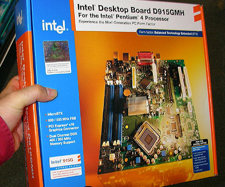 Een foto van het moederbord laten zien dat het een Micro BTX D915GMH bord is, bestemd voor een Pentium 4. Zoals aangegeven op de verpakking heeft dit BTX moederbord een BTX kast en een BTX warmte module nodig.