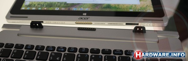 De twee worden met een krachtige magneetjes met elkaar verbonden en er zijn twee geleiders die er voor zorgen dat de twee op de juiste manier gekoppeld wordt. Het klinkt als een mooi systeem, maar zoals we al op het podium kunnen zien bij de presentatie, maar ook in de praktijk zelf ervaren: je moet goed opletten dat je de tablet op de juiste manier op het dock plaatst. Zet je het scherm een beetje schuin op de dock, dan trekken de magneten hem toch vast. Aan de andere kant: als je hem eenmaal vast hebt zitten zit hij ook echt vast. Je kunt hem net als bij een echte laptop moeiteloos aan het scherm optillen zonder dat het keyboard er zomaar vanaf valt.