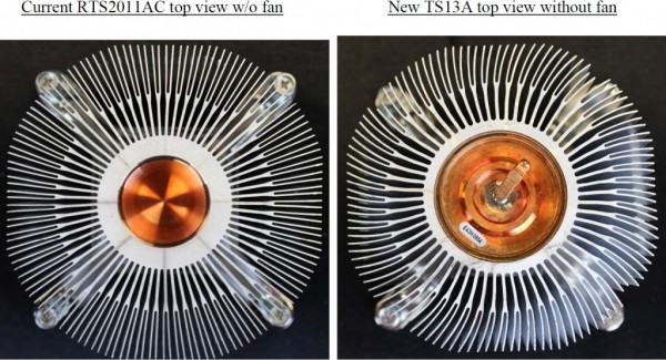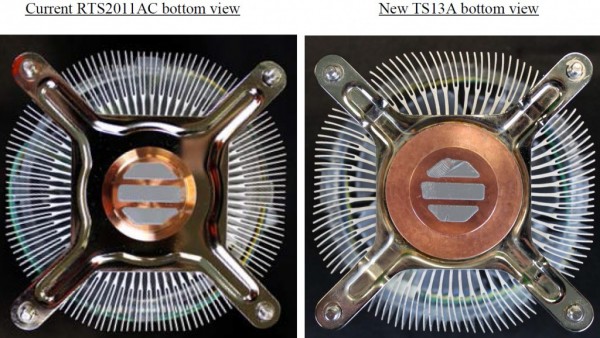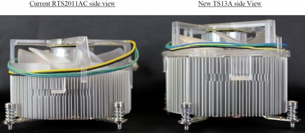 De nieuwe koeler gaat als TS13A door het leven en vervangt de oudere RTS2011AC-koeler. Via een aantal side-by-side afbeeldingen kunnen de twee koeloplossingen met elkaar vergeleken worden. De nieuwe TS13A-koeler is 75 mm hoog, wat betekent dat deze 12 mm hoger is dan zijn voorganger. Ook de koperen kern is vervangen door een heatpipe die in combinatie met de gebogen koelvinnen voor betere koelprestaties zou zorgen. Al met al is alles vergroot of efficiënter gemaakt om zo een betere koeling te kunnen realiseren.