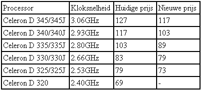 Volgens bronnen bij Taiwanese moederbordfabrikanten is Intel van plan om op 20 februari 2005 de prijzen van de Celeron D processor te verlagen. De prijzen van de Pentium 4 zullen ongewijzigd blijven. De Celeron D 320 (2.40GHz) zal geen prijsverlaging krijgen omdat deze geleidelijk uitgefaseerd wordt.