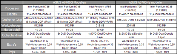 ASUS heeft met drie varianten van de A6700G en twee varianten van de A6700Ne haar mobiele arsenaal uitgebreid. De zilverkleurige notebooks met Intel Pentium-M cpu’s (al naar gelang de uitrusting met een M 725, 735, 745 of 755) zijn uitgevoerd met een 15,4 inch breedbeeldscherm (1280x800 pixels), een 8-speed DVD dual d/l double layer speler en zelfs een 0.35 Megapixel videocamera in de klep.
