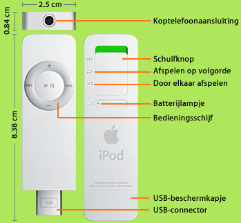 De iPod Shuffle opladen en er muziek naartoe kopiëren vanaf een Mac of pc gaat heel gemakkelijk door de iPod shuffle op een USB-poort aan te sluiten. De iPod Shuffle kan tevens fungeren als draagbare USB-flash-schijf, waarmee gebruikers tot 1 GB ruimte hebben om back-ups van bestanden te maken en bestanden uit te wisselen tussen computers.