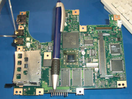 Transmeta kwam dit jaar tijdens de Consumer Electronics Show met een fraai nieuw moederbord. Erg klein is het ook, zoals op de foto de vergelijking met een pen te zien is. Het moederbord heeft Compact Flash en DIMM sloten en alles wat verder van een notebook verwacht mag worden. De verwachte prijs is 1450 euro.