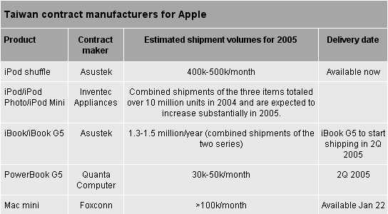 Daarnaast zal ASUS in het tweede kwartaal van dit jaar ook beginnen met de verzending naar Apple van de iBook G5 notebooks. Volgens bronnen bedroeg de verzending van de huidige iBooks in het laatste kwartaal van 2004, 110.000 tot 120.000 stuks per maand. [jpy]