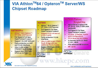 VIA update serverchipset roadmapVIA heeft een slight over haar servertoekomst vrijgegeven. Het gaat om de serverplatformen die voor 2005 gepland staan. De Tahoechipset is bedoeld voor Athlon 64 (FX) en Opteron processoren en biedt een 64-bit PCI-X 66/100/133MHz interface. De K8T935 is ene northbridge en southbridge in één en biedt ondersteuning voor 6 S-ATA II kanalen met RAID 0, 1, 0+1 en JBOD.