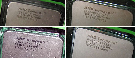 De lettercombinatie BA in de modelnummers geeft aan, dat de processors daadwerkelijk volgens het 90nm productieproces gefabriceerd zijn. Hoewel de nieuwe core op dit moment weinig merkbare verschillen zal brengen vergeleken met de 130nm core, zullen toekomstige Semprons door de nieuwe core sneller en goedkoper worden. Het cijfer voorafgaand aan de lettercombinatie BA, in dit geval een 2 of een 3, duidt op een L2 cache geheugen van 128 KB (kilobyte) of 256 KB. Uit de serienummers kunnen we opmaken, dat de 256 KB Semprons (de 2800+ en de 3100+) eerder geproduceerd zijn dan de 128 KB Semprons: