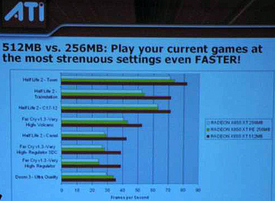ATI heeft afgelopen weekend op het Texas Gaming Festival in Dallas een afbeelding laten zien die duidelijk maakt dat haar nieuwe grafische kaart met 512MB geheugen een hoge prestatiewinst laat zien ten opzichte van de 256MB grafische kaarten. Het bedrijf zei dat de vergrote locale buffer het mogelijk maakt om de prestaties te vergroten in gevallen met de meest veeleisende settings.