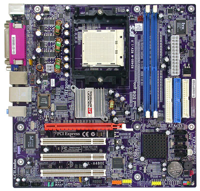 Onboard video wordt geleverd door een op de Radeon 9600 gebaseerde chip die overweg kan met DirectX 9. Daarnaast is een PCI-Express x16 slot beschikbaar. Verder is het mogelijk tot maximaal 2 GB aan geheugen te plaatsen (DDR400/333/266) en biedt het moederbord plaats aan 3 PCI sloten, 4 ATA en 4 SATA (RAID 0, 1, 0+1) aansluitingen. In onboard geluid wordt voorzien door de Realtek ALC655 )6 kanaals). LAN en 8 USB 2.0 aansluitingen zijn eveneens aanwezig.