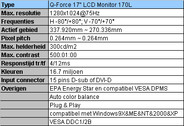 Q-Force komt met een nieuwe 17" LCD monitor, de 170L. Het scherm heeft een contrastverhouding van 500:1 en een helderheid van 300cd/m2. De responstijd bedraagt 16ms. De monitor kan geleverd worden in twee kleuren: zilvergrijs en zwart.