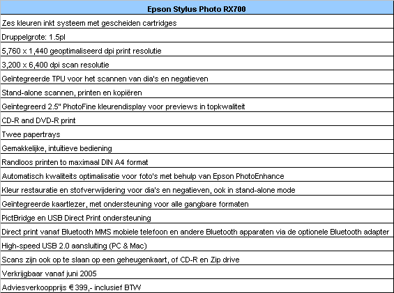 Epson introduceert een nieuwe all-in-one, de Epson Stylus Photo RX700. De RX700 is inmiddels bekroond met een iF Design 2005 Award. Epson richt zich met deze all-in-one op alle vrijetijds fotografen die thuis digitale beelden printen of oude foto’s restaureren.