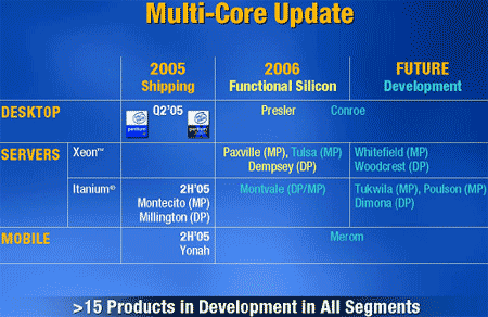 Na het eerdere bericht over de overstap naar 65nm heeft Intel ook bevestigd dat de nieuwe generatie dual core processoren, nu nog bekend onder codenaam Conroe en Merom eind 2006 het licht zullen zien. De aanduiding “tweede generatie dual core” zou kunnen betekenen dat het om een compleet nieuwe architectuur gaat.