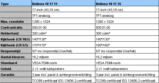 De schermen zijn voorzien van een analoge VGA aansluiting en doen hun werk op 60 Hz bij een resolutie van 1280x1024. Volledige specificaties van beide modellen staan in onderstaande tabel weergegeven: