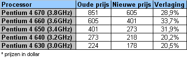 Elk model is in prijs gezakt: de Pentium 4 670 ging van $851 naar $605; model 660 zakte van $605 naar $401; de 650 daalde van $401 naar $273 en de overige modellen, de 640 en 630, daalden van $273 naar $218 en van $224 naar $178.