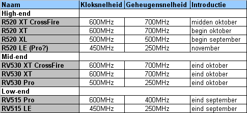 Voor de R520 mogen we 4 modellen verwachten: R520 LE/Pro, R520 XL, R520 XT en R520 XT CrossFire Edition. De XL zal begin september verschijnen, terwijl de XT op zich laat wachten tot oktober. De LE/Pro zal volgens AnandTech pas in november verschijnen.