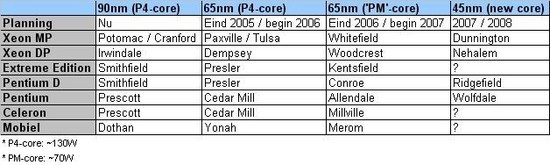 Intel wil het energieverbruik voor haar toekomstige processors drastisch gaan verlagen. Het gaat hier om de desktopversie van de Pentium-M; tot nu toe gekend als "Conroe". Samen met de introductie van deze nieuwe chip, gepland voor de tweede helft van volgend jaar, zal Intel een 64bit Yonah (Merom) en een single-core Celeron M lanceren. Intel mikt op een verbruik van van 30W tot 35W per core, wat neerkomt op 60 tot 70W per processor. Net als de Presler (de 65nm versie van Smithfield) zal Conroe aangeduid worden met een nummer dat begint met een 9. Tevens zullen deze gebruik maken van de huidige LGA775 socket. HyperThreading zal niet aan boord zijn, maar het cachegeheugen wordt vergroot van 2MB naar 4MB. [KS]