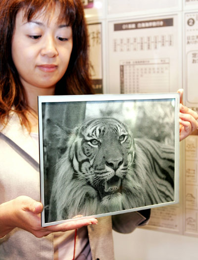 Een werknemer, in dit geval werkend voor gigant Hitachi, demonstreert ’s werelds grootste elektronisch papier. Het elektronisch papier, wat voornamelijk een dun vloeibare kristallen bestaat, meet ongeveer 25 bij 20 centimeter en is ruim een centimeter dik. [Sm4sh]