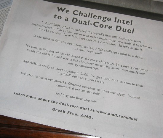 Een Intel Developer Forum is natuurlijk niet compleet zonder AMD, dat traditiegetrouw in een hotel in de buurt van het conventiecentrum de aankondigingen van Intel probeert te overtreffen. Dit jaar had AMD een leuke marketingstunt in petto. Op de eerste dag van IDF plaatste men in een aantal grote Amerikaanse kranten, waaronder USA Today en de Wall Street Journal, een paginagrote advertentie, waarmee men Intel uitnodigt voor een 'dual-core duel'. Intel CEO Paul Otellini wilde er na zijn keynote niet echt op in gaan en zei dat de markt maar moest beslissen wie de beste was.