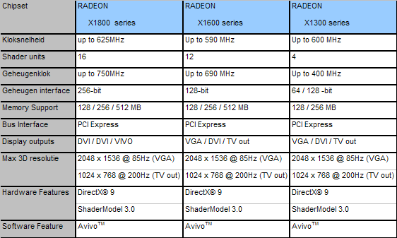 Op de hoogste trede van de ladder vinden we de Radeon X1800XT en de X1800XL terug. Beide zijn uitgerust met 16 pipelines en hebben een 512-bit ring-bus geheugencontroller aan boord. Dankzij het multi-threading architectuur kunnen de kaarten tot 512 threads tegelijk verwerken. Op gebied van beeldkwaliteit vinden we zaken als High Dynamic Range (HDR) en 12x Anti-Aliasing terug. Tevens is er ondersteuning voor ATI’s Avivo technologie en de mogelijkheid voor het afspelen van de High Definition video standaard aan boord.