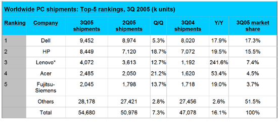Het Chinese Lenovo, welke vorig jaar de pc divisie van IBM heeft overgenomen, staat op de derde plaats van de ranglijst van grootste pc bouwers met 4,1 miljoen verscheepte pc's in het derde kwartaal. Dit is een toename van 12,7 procent ten opzichte van het tweede kwartaal. Lenovo bereikt daarmee een marktaandeel van 7,4 procent. Met name door de overname van het IBM onderdeel is de pc productie van Lenovo aanzienlijk gestegen in geheel 2005.