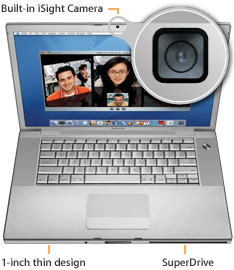 De nieuwe MacBook Pro heeft een 15-inch beeldscherm dat 67 procent helderder is dan dat van de PowerBook G4 en even helder als een Apple Cinema Display. Bovendien heeft de MacBook Pro een volledig vernieuwde systeemarchitectuur voor snellere prestaties, inclusief een 667-MHz frontsidebus, die vier keer zo snel is als de frontsidebus van de PowerBook G4, en 667 MHz DDR2 SDRAM-geheugen (uitbreidbaar tot 2 GB) dat twee keer zo snel is als het geheugen van de PowerBook G4. Elke MacBook Pro wordt standaard geleverd met de ATI Mobility Radeon X1600 PCI Express-videokaart met 128 of 256 MB GDDR3-videogeheugen. Elke MacBook bevat bovendien een ingebouwde Bluetooth 2.0+EDR-module (Enhanced Data Rate), ingebouwd 54-Mbps AirPort Extreme (802.11g WiFi), een trackpad met scrollfunctie en de Sudden Motion Sensor van Apple, die de harde schijf beschermt als de computer valt.