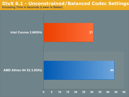 In de videobewerkingstesten, waar de X2 processoren van AMD veelal gelijkwaardig of beter presteerden dan de Pentium D processoren loopt het voordeel voor de Conroe op tot 30%