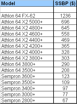 Op dailytech zijn de SSBP (system builder prices) verschenen van de aankomende socket AM2 desktop processoren. Volgens de site zouden OEM's en systeem bouwers de nieuwe processoren kunnen bestellen vanaf 15 mei. De gehele range zou per deze datum beschikbaar zijn, ook de 64 bit Sempron modellen.