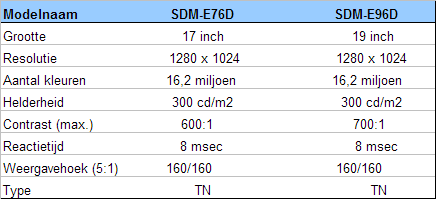 De E-serie-beeldschermen zijn vanaf 19 juni 2006 verkrijgbaar. De geschatte prijzen voor de eindgebruiker zullen € 239,-- voor de SDM-E76D en € 299,-- voor de SDM-E96D (beide inclusief BTW) bedragen.