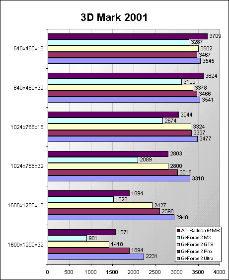 Voor de test is gebruik gemaakt van een AMD Athlon 1 GHz (266 MHz FSB), 256 MB PC133 geheugen, Epox 8KTA3 VIA KT133A moederbord en een Seagate Baracuda ATA II harddisk. Noot: voor het probleemloos kunnen benchmarken van de ATI Radeon met 3D Mark 2001 zijn én de laatste nieuwe DirectX 8.0 compatible drivers van ATI vereist én de nieuwste VIA 4-in-1 driver (4.29) in geval van een moederbord met VIA chipset.