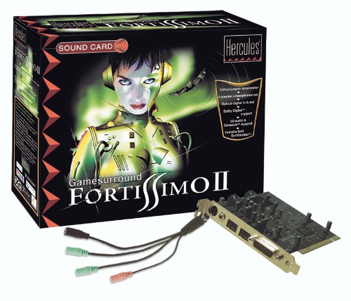 Hercules introduceert een vernieuwde versie van de Maxi Sound Fortissimo. De kaart die naar de naam Gamesurround Fortissimo II luistert is voorzien van een koptelefoonuitgang en de mogelijkheid om vier speakers aan te sluiten. Op het mtetalen rack bevindt zich ook een optische in-en uitgang. Het bedieningspaneel dat onder andere een 10-kanaals equalizer bevat is makkelijk toegankelijk via de taakbalk in Windows.