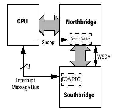 (...)This requires that all hardware interrupts be connected to the IOAPIC, and that the IOAPIC be connected to the processor’s local APIC. The communication between the IOAPIC and the local APIC occurs over a separate sideband bus. A comparison of this configuration to the traditional PIC configuration is shown in Figure 1 on page 3. Operation with the IOAPIC and the local APIC requires all of the Northbridge’s posted write-buffers to be properly flushed to coherent memory before the IOAPIC sends an interrupt message to the processor. This is required to prevent potential data coherency problems that may result when the processor receives an interrupt and reads stale data because the data most recently written by the PCI Bus master still resides in a posted write-buffer in the Northbridge. Non-APIC implementations do not have the potential for this problem because the processor’s interrupt acknowledge cycle that traverses the PCI Bus is serializing in nature, thus all posted-write buffers are flushed before the processor reads memory in the interrupt service routine.(...)