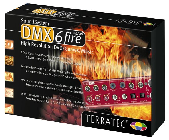 De audio-specialisten van TerraTec uit Nettetal, Duitsland, introduceren het nieuwe resultaat van hun ontwikkelingsafdeling: de 6 kanaals geluidskaart DMX 6fire 24/96. Deze 5.1 geluidskaart biedt 24 Bit/96 kHz signaal verwerking voor opname en weergave. Gemaakt voor de geluidsbeleving en uitgevoerd met een volledig uitgeruste 5¼" frontmodule. Volgens TerraTec is de DMX 6fire 24/96 "een stap vooruit op weg naar perfectionisme in audio reproductie en mastering". De 24 Bit/96 kHz technologie is afgeleid van de high-End EWS- en EWX serie. Hobby muzikanten zullen blij zijn met de 5-pins MIDI DIN in- en uitgang, drie stereo uitgangen, een stereo ingang, optische- en coaxiale digitale in- en uitgangen (tussen 8-96 kHz) via de (standaard bijgeleverde) 5¼" frontmodule, ASIO 2.0 drivers met een latency van 2 ms en een signaal-ruis afstand boven de 100 db.